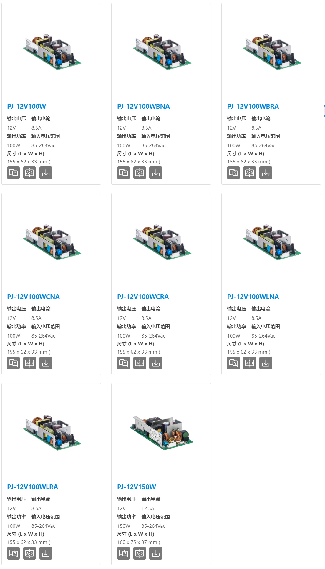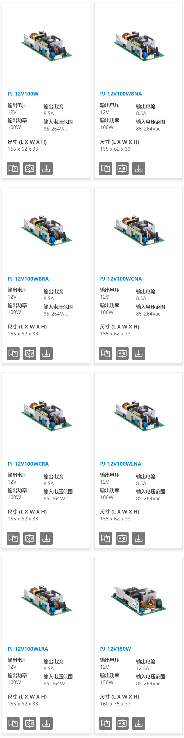 开架型电源可提供各种额定输出电压,有多种配置选项可供选择。产品并符合IEC60950-1 / 62368-1的主要国际安全标准。最新的 PJB系列内建高功率提升性能,可维持长达10秒200%的功率提升。产品设计皆在国际工业足迹标准之下。内置式PFC ? 多种配置选择 ? 电路板三防胶涂布
