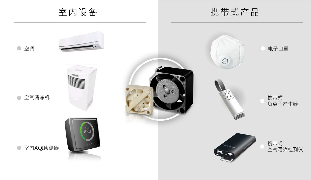 空气净化产品内的空气侦测传感器是一个非常关键的组件,能够帮助空气导流,吸入和排除空气,侦测空气悬浮微粒、PM2.5等污浊物质;一颗拥有精准转速控制的风扇能让传感器更精准发挥各项侦测的功能。随着电子产品智能化的发展,空调、空气清净机、负离子机等IAQ 相关产品大量结合高精度传感器所侦测到的数据提供实时的空气净化,让人类的生活更舒适。